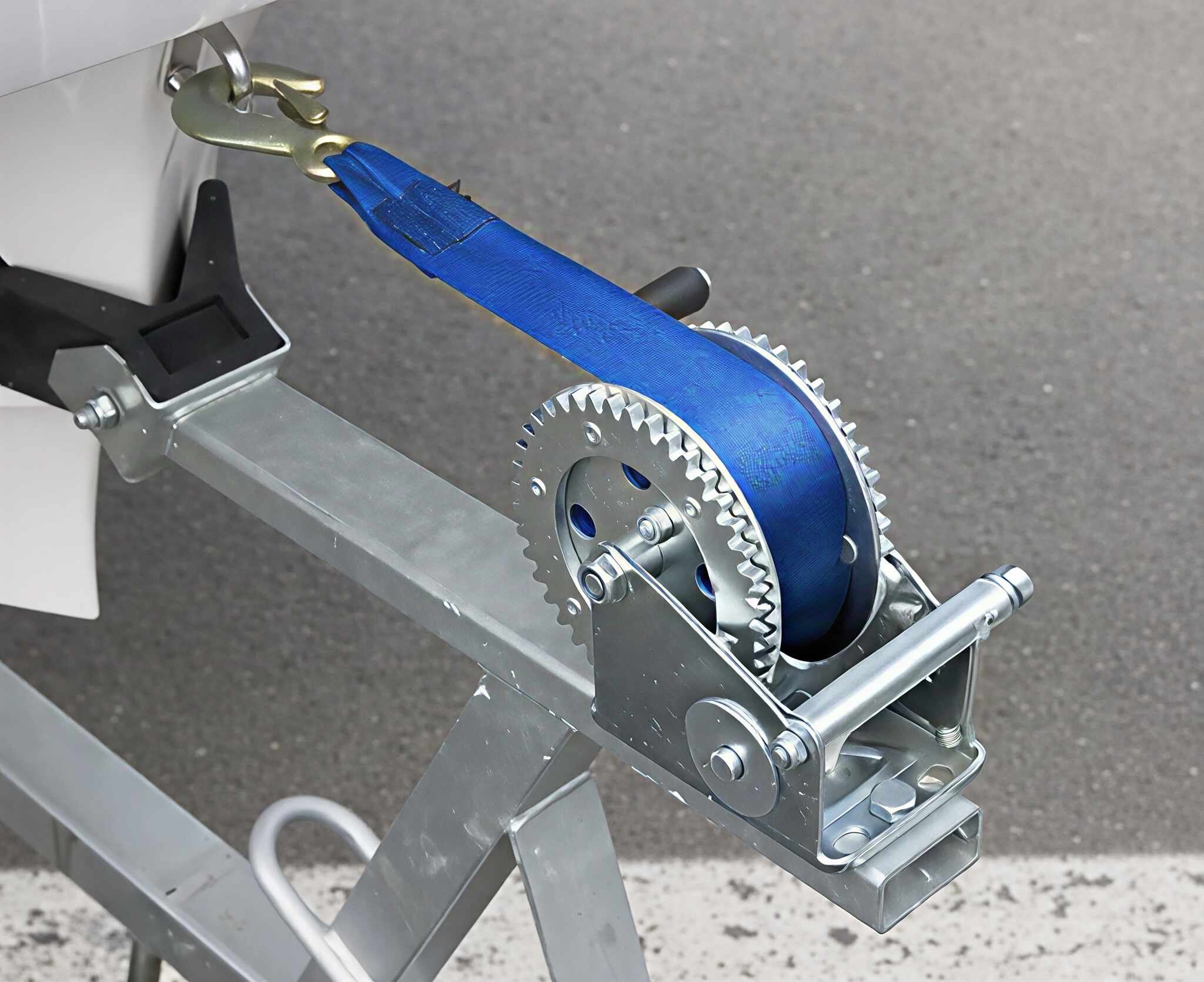 Cabrestante de 1000 lb: relación de transmisión 4:1, correa de poliéster de 2 pulgadas, velocidad de tracción de 20 pies/min, longitud de correa de 50 pies.